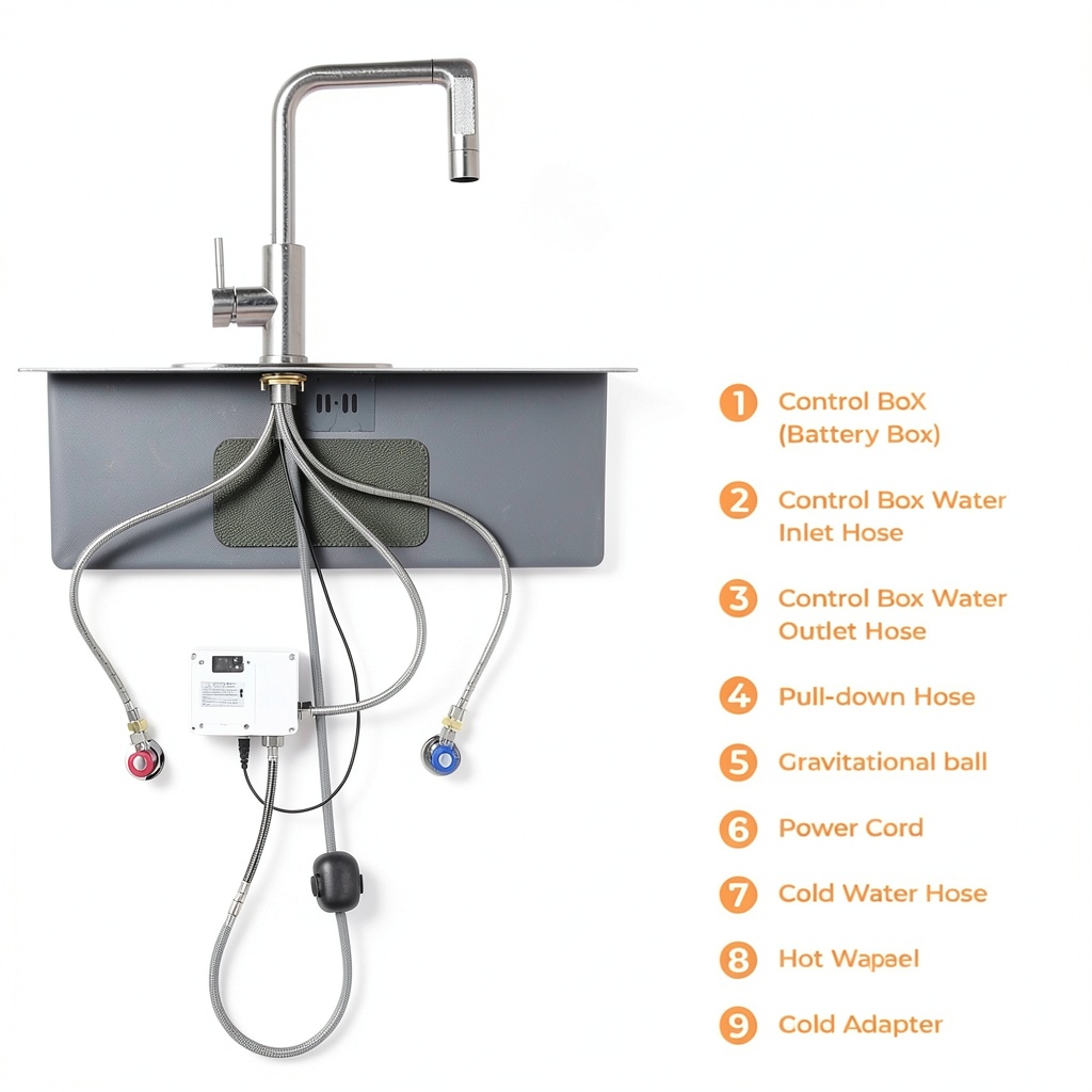 You receive the touchless kitchen faucet with sprayer, deck plate, water hoses, white control box, and an instruction manual for straightforward setup.