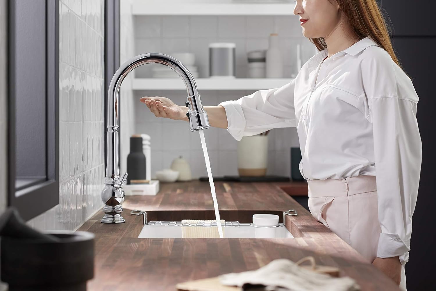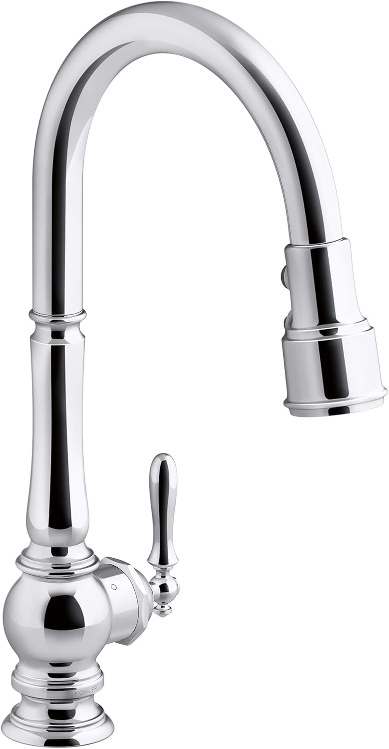 The Kohler Artifacts touchless kitchen faucet combines innovative technology with elegant design to transform your kitchen experience. Crafted from durable metal with a polished chrome finish, this faucet features a high-arc spout and deck mount installation for versatile use. Key specifications include a weight of 8.6 pounds, dimensions of 4.47 x 9.06 x 17.61 inches, and a single-handle design with right-handle location. It operates on AC power, eliminating the need for battery replacements, and includes advanced motion sensor technology for reliable touchless activation. The LED indicator light ensures the system is ready, while voice control allows for hands-free operation, making it a smart addition to any modern kitchen.